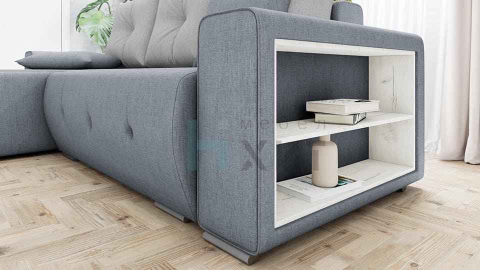 Благодарение на декоративната етажерка, вградена в подлакътника, имате удобно място за организиране на любими книги, дистанционни, или малки аксесоари, което прави дивана не само удобен, но и функционален център във всекидневната.
