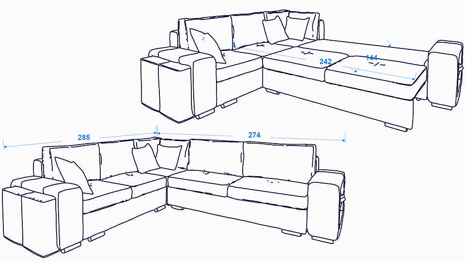 Модулна система Хит 2 – Конфигурация 5 е универсално решение за вашия хол, което комбинира стил, практичност и комфорт. С размери 285 см х 274 см и просторна спална площ 242 см х 144 см, тази конфигурация е подходяща както за семейни вечери, така и за настаняване на гости.