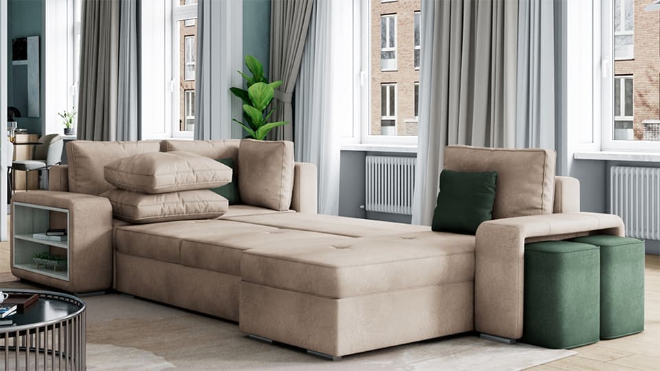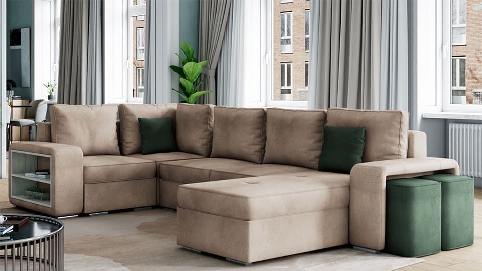 - Две вградени табуретки: В единия подлакътник са вградени две практични табуретки, които могат лесно да се извадят и използват при необходимост. Това е идеално решение за гостите ви, когато имате нужда от допълнителни места за сядане.