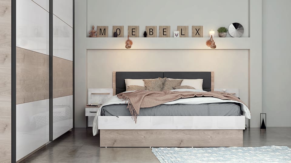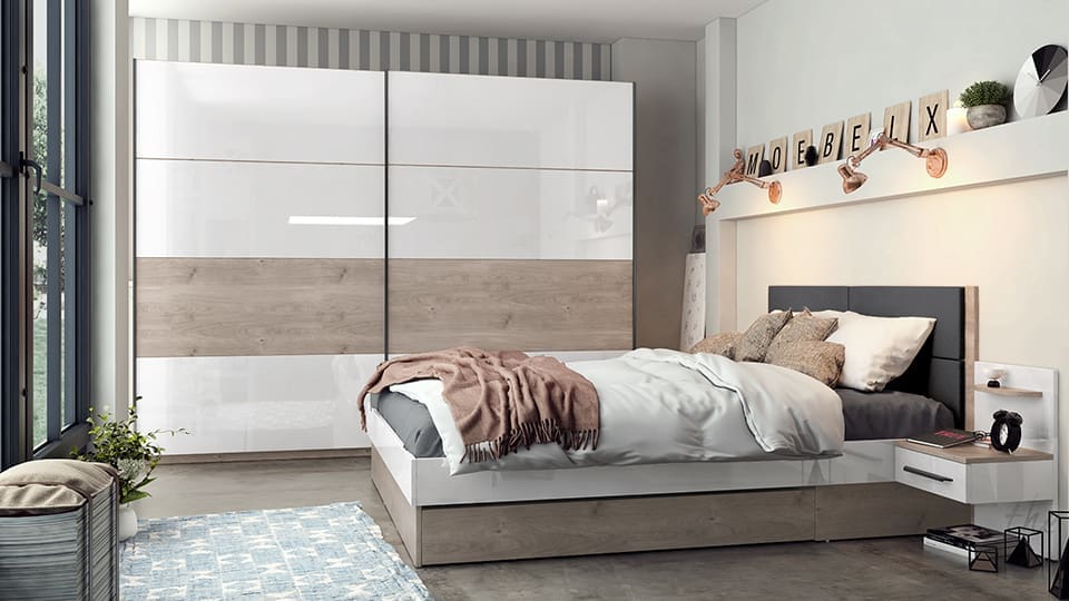 Спален комплект Тревизо – ПДЧ 18 мм ✓ тапицирана табла ✓ плъзгащи врати ✓ 160/200 ✓ големи чекмеджета ✓