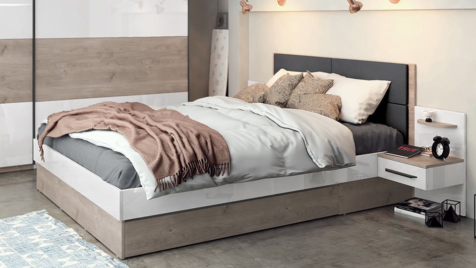Легло: Леглото с размер 160/200 см. е подходящо за стандартен матрак и предлага удобно място за сън. То разполага с две големи чекмеджета за съхранение, които са перфектни за прибиране на допълнителни одеяла, възглавници или други вещи, които искате да държите под ръка. Таблата на леглото е с тапицерия, добавяйки допълнителен комфорт и луксозен акцент.
