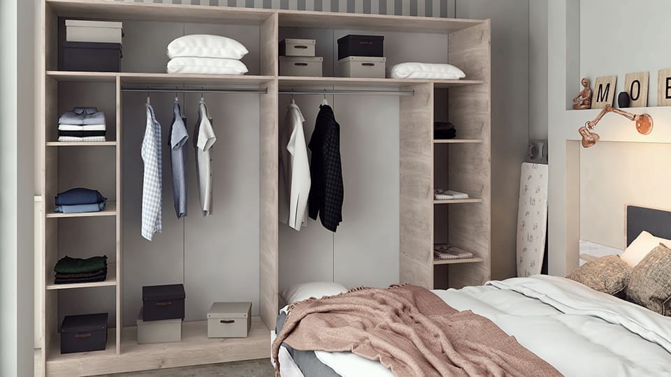 Гардероб: Голям гардероб с плъзгащи врати предлага максимално използване на пространството. Лесно се отваря и затваря, като същевременно предлага достатъчно място за съхранение на дрехи, аксесоари и други лични вещи. Със своята изчистена линия и стилни врати, гардеробът е важен елемент за модерната спалня.